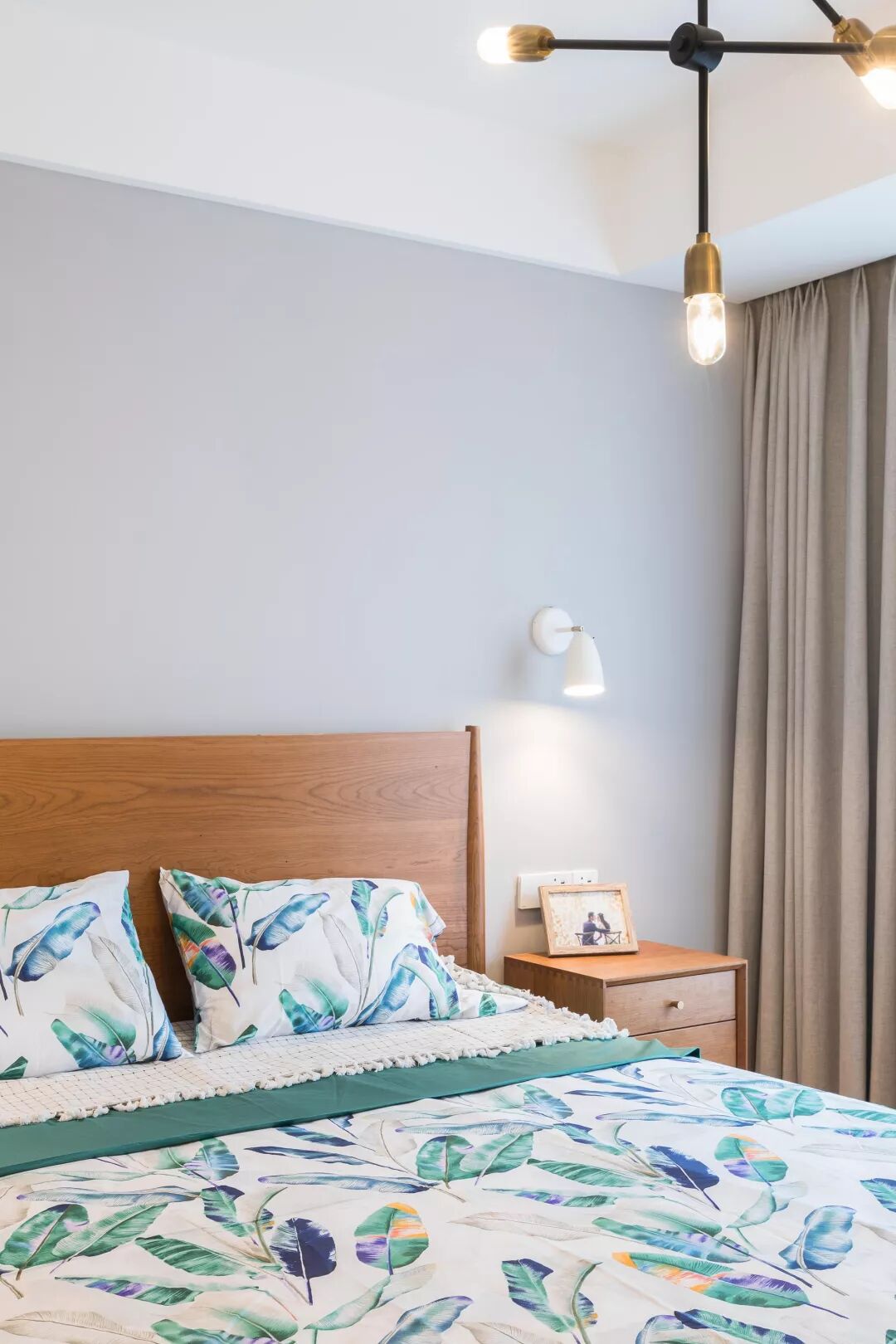 卧室的简约吊灯很有设计感,像树枝一样,这样也有利于房间内每个角度的采光,床头的两盏小壁灯和床头柜上的小台灯补充照明。