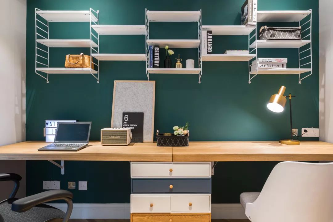 书桌其实是一张搁板,中间的调色收纳柜将整个空间分成了两个书桌,墙面上的搁板做成了书架,很有个性。
