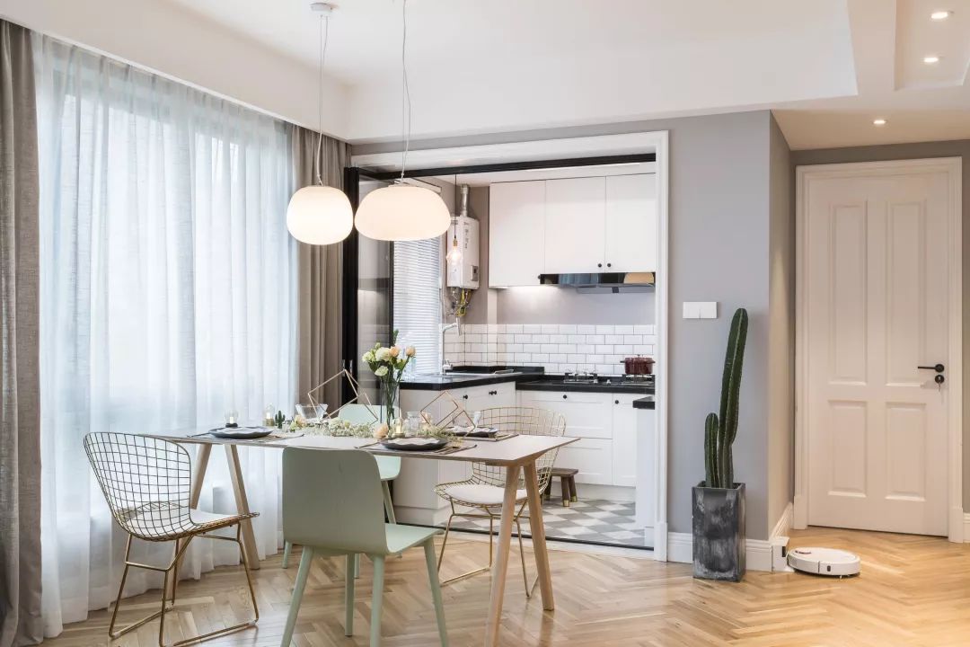 用折叠式玻璃门将厨房和餐厅隔开,玻璃门阻挡了油烟的蔓延,又保证了厨房的采光通透性,有利于家人们之间的沟通,做饭的时候随时和外面的人沟通。厨房门旁边的仙人掌在空间上也起到了一定的隔断作用。