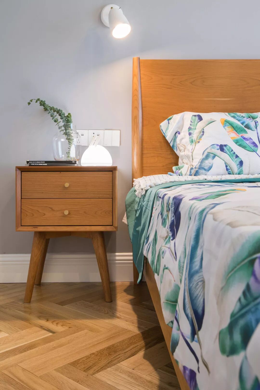客厅的整个色调分为三个部分,一是墙面的浅灰色,低调中又带点清新,二是吊灯的纯白色,干净大气,三是地板上的木色,三个颜色形成三个大色块,地板砖的拼接方式拉伸了客厅的纵深感。