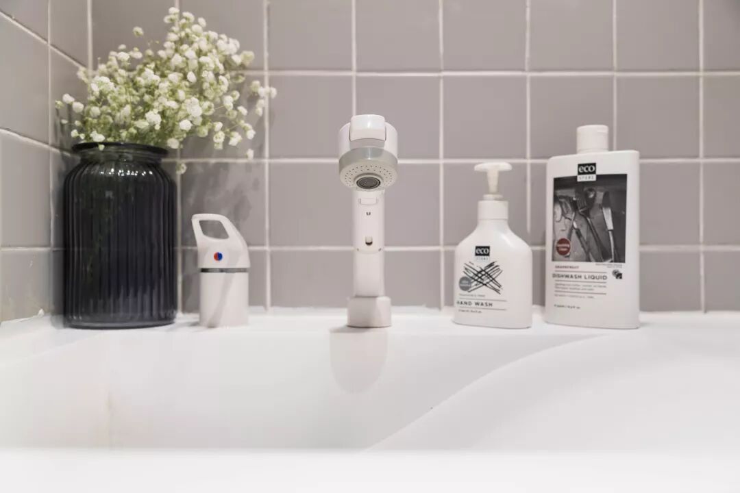 纯白色的洗手台和墙面的浅灰色小砖形成对比,台面上放置了一个小花瓶,作为装饰摆放在这里。