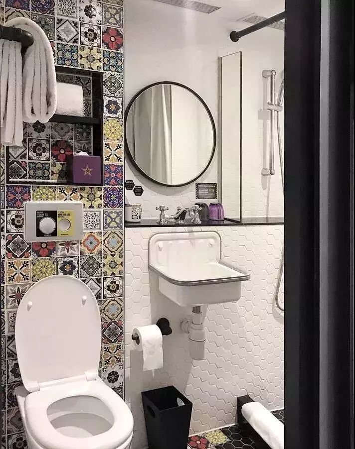 卫生间的格局基本是固定的,其中各种洁具的颜色也大多围绕白色、金色、银色等较素雅的颜色展开。如何摆脱卫生间在形式和颜色上的单调,墙砖和地砖的选择尤为重要。铺设花砖是近年来常用的手法。不管是局部铺设起点缀作用,还是铺一整面墙或几处呼应着铺,最终呈现的效果都十分不错。